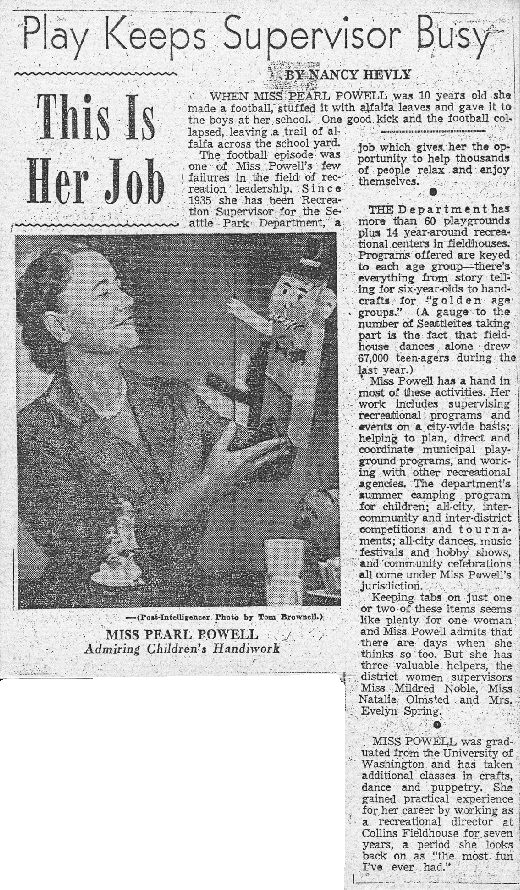 Pearl Powell accepted her first position with the City when Bertha Landes was Mayor. Powell was employed by the Parks Department as playground "instructress" at Collins Playfield from 1927 to 1935. She took summer school classes at Cornish while in college and studied theater puppetry with Tony Sark, as well as dance, including classes in modern dance with Martha Graham. In 1927, while attending the University of Washington on a scholarship, she worked as a play leader for the Parks Department to earn money for her room and board.