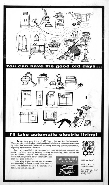 City Light promoted the use of electric appliances in the 1950s and 1960s as time-saving devices for the homemaker. "The modern Seattle housewife lives better, for less, electrically" the advertisement stated. Along with Prudence Penny (Maurine Kelley) of the Seattle Post-Intelligencer and others, Norris appeared at the Seattle Home Show in the 1950s as "a noted home economist" offering hints and helps for the homemaker. Norris also had her own home economics television show on KIRO where new electric appliances were modeled. By the time Norris left City Light in 1976, home economics had become consumer education, and the emphasis changed from promoting the use of electricity to conserving it.