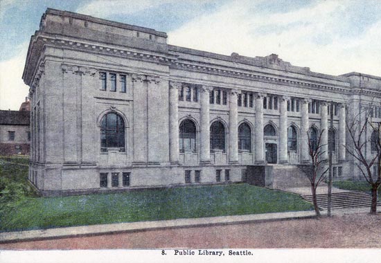 The Seattle Public Library was housed at various locations in its early years, including the Yesler mansion at Third and James, which was destroyed by a fire in 1901. With the help of Carnegie funds, a new Central Library opened in 1906 between Fourth and Fifth at Madison and Spring.