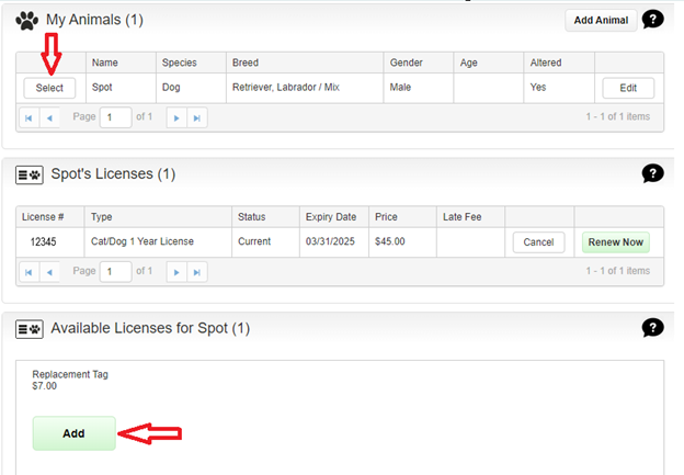 Log in and select the animal in the My Animals section. Under Available Licenses, select "Replacement Tag." Then select the license type in the pop-up and click the "Add" button, and the replacement tag will be added to your cart. You can renew at the same time or just purchase the replacement tag.