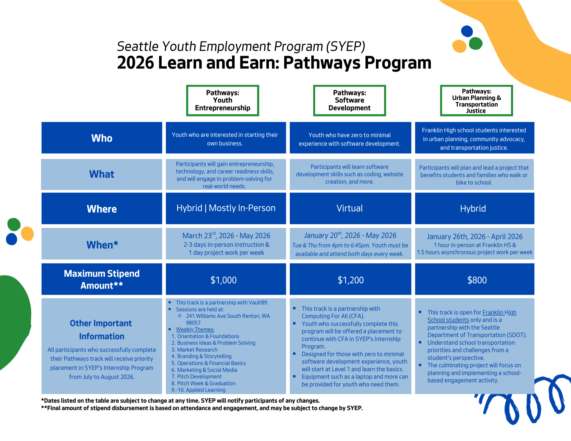 The Seattle Youth Employment Program (SYEP) features two programs to help you develop skills for life and work that will help achieve your current and future goals: