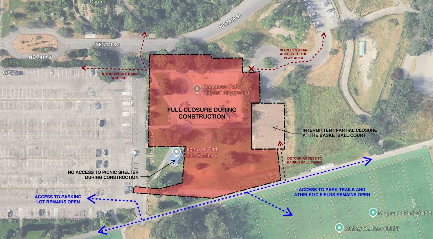 Construction impact map of Magnuson Park showing full closure of the Airport Playground and Picnic Shelter 3, intermittent closure of the basketball court, detour routes for pedestrian and basketball court access, and open access to the parking lot, trails, and athletic fields