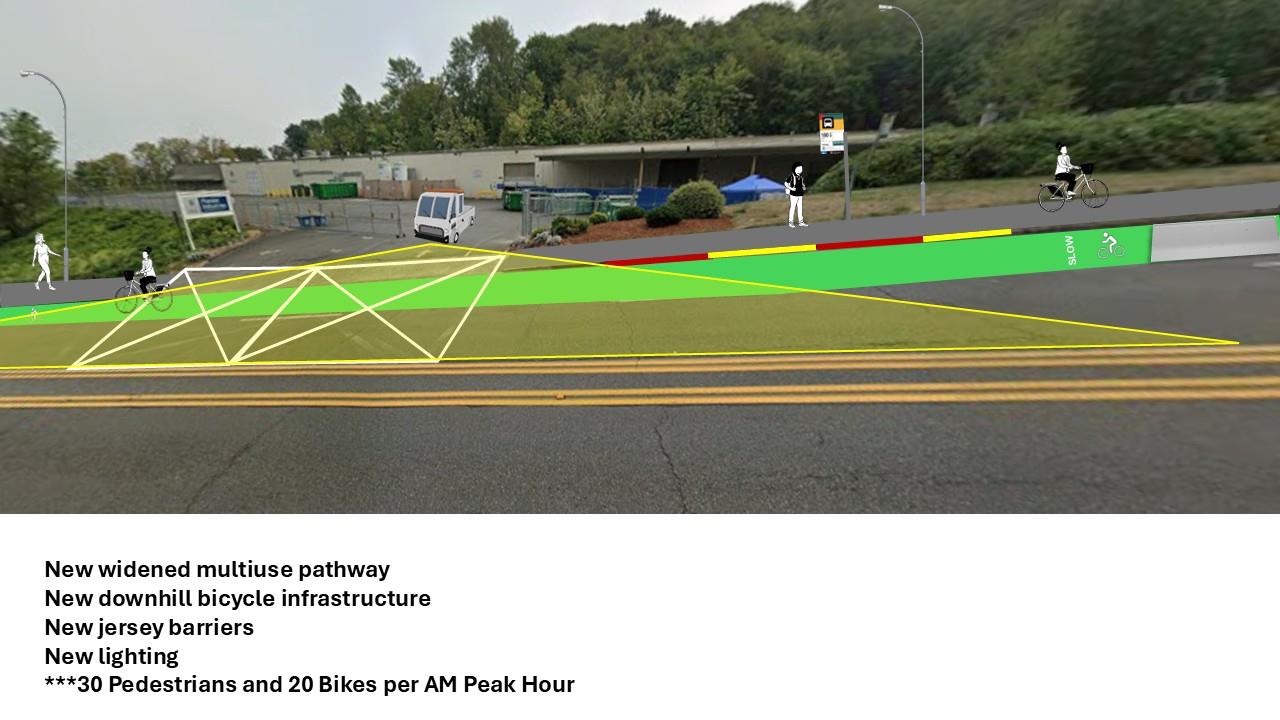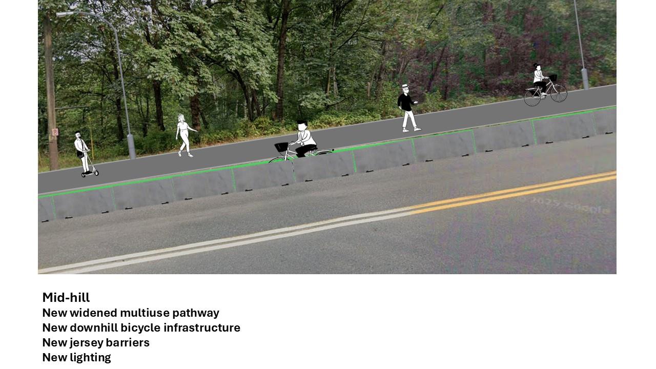 - Safety Priorities: We heard questions regarding the placement of Jersey barriers. Some neighbors suggested that barriers should be used to separate uphill and downhill vehicle traffic in the centerline rather than (or in addition to) protecting people walking and biking on the path and bike lane.