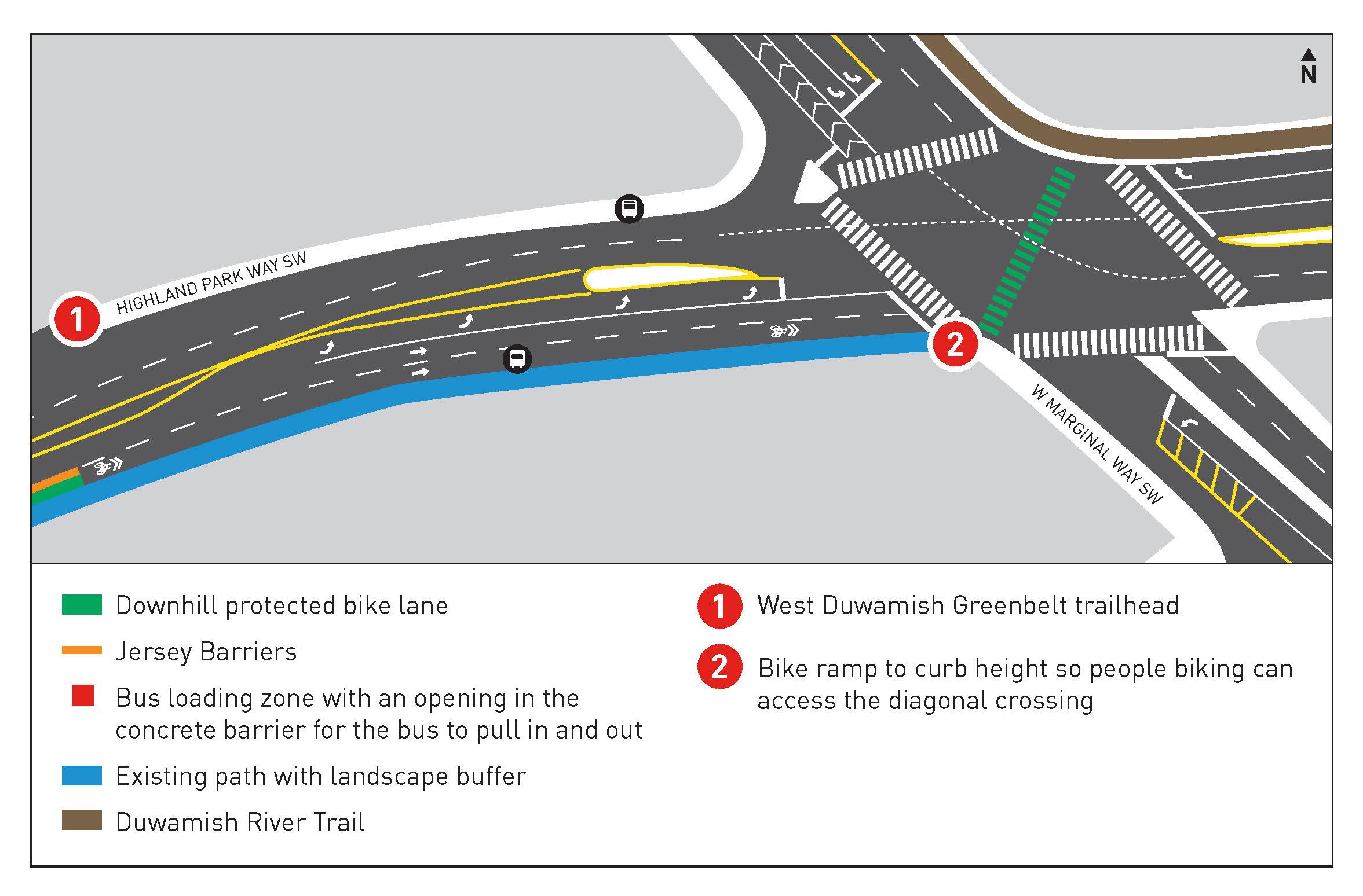 - New lane layout options to maintain traffic flow while slowing speeds and calming traffic, improve bike and pedestrian connection, and address wait times at W Marginal Way SW