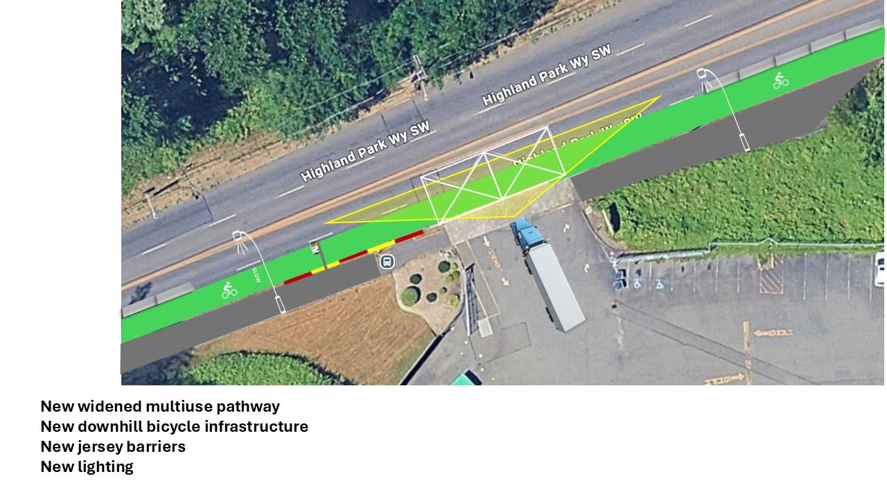 The Highland Park Way SW Connection project is intended to provide an improved path for people to walk, roll, and bike between Highland Park and the Duwamish River Trail, while improving safety and calming traffic along Highland Park Way SW.