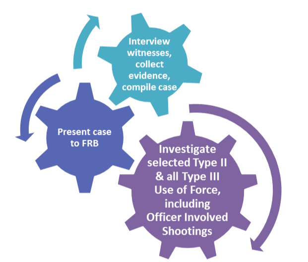 FIT has a critical role in ensuring that the use of force investigations are thorough, objective and complete. Investigators are trained to not only determine what happened in respect to the officer's application of force but all events and circumstances leading up to the incident. By policy, FIT investigators are required to respond to the scene of all officer-involved shootings, in-custody deaths, Type III use-of-force, Type II use-of-force when requested by a supervisor and serious assaults against an officer. Their role is to investigate the facts and circumstances surrounding the use-of-force. This includes interviewing witnesses, both civilian and police, as well as (if possible) the subject involved in the use-of-force. They collect and document both physical and video evidence (with the assistance of the Crime Scene Investigation Team.) FIT investigators have 30 days to put together their case, which is then presented to the Force Review Board (FRB). FIT is an independent investigative unit, not tied to the Office of Professional Accountability (OPA), however, representatives from OPA do observe various aspects of any FIT investigation. FIT does not determine if the use-of-force applied by an officer was justified, legal or within Department policy. Their role is to gather evidence and construct an unbiased and comprehensive case that lays out the circumstances of the incident. If in the course of the FIT investigation, any potential misconduct is identified, FIT detectives are required to make a referral to OPA.