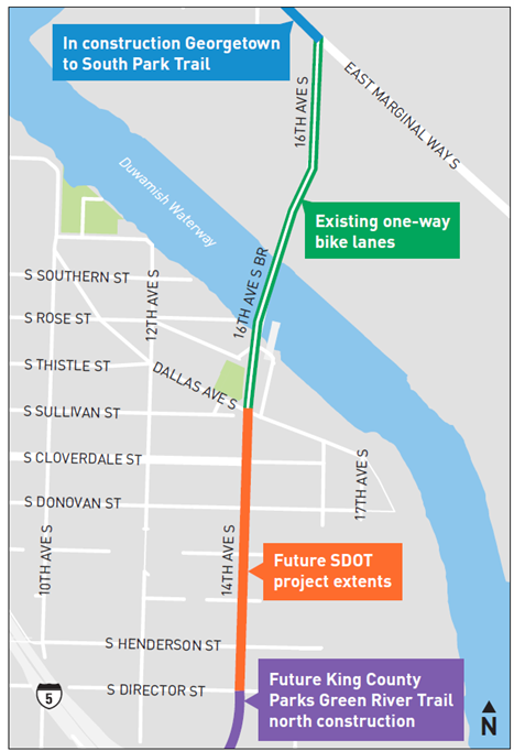 Additionally, South Park is soon to be a gap in the regional trail network following the recent completion of the Georgetown to South Park project to the north and King County’s upcoming Green River Trail Extension project to the south. Completing a path link along 14th Ave S ensure that the street is ready for more people walking and biking to and through South Park.