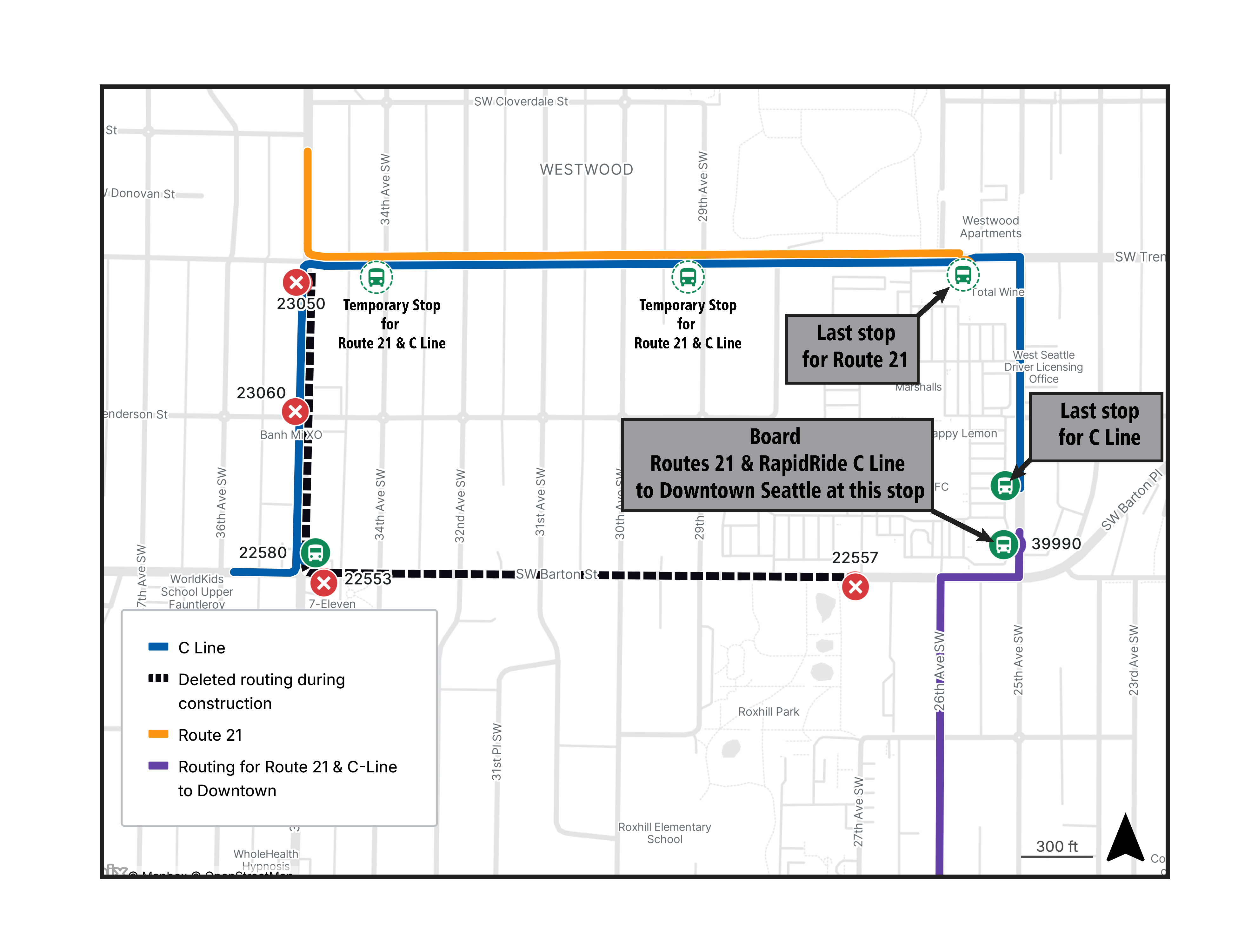 Part of SW Barton will be closed during construction so that we can do our work. You can expect some bus stops and the layover zone to shift to a new location and some bus routes to change (temporarily) during construction. See the changes below: