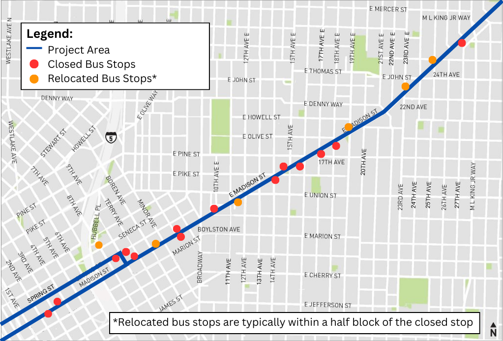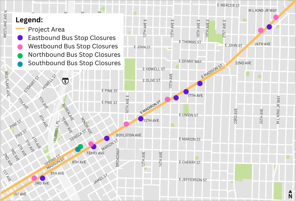 Eastbound E Madison St is closed between 12th and 15th Aves while we complete replacement of a 120-year-old watermain, relocate utilities, and begin to repave the street. Eastbound traffic is detoured to E Union St and 19th Ave. We expect the eastbound closure and detour to remain through the Spring. Madison St is narrower between 14th and 20th Aves, which is why we need to close one direction of traffic as we repave the street. There is a signed detour for people driving and buses are rerouted.