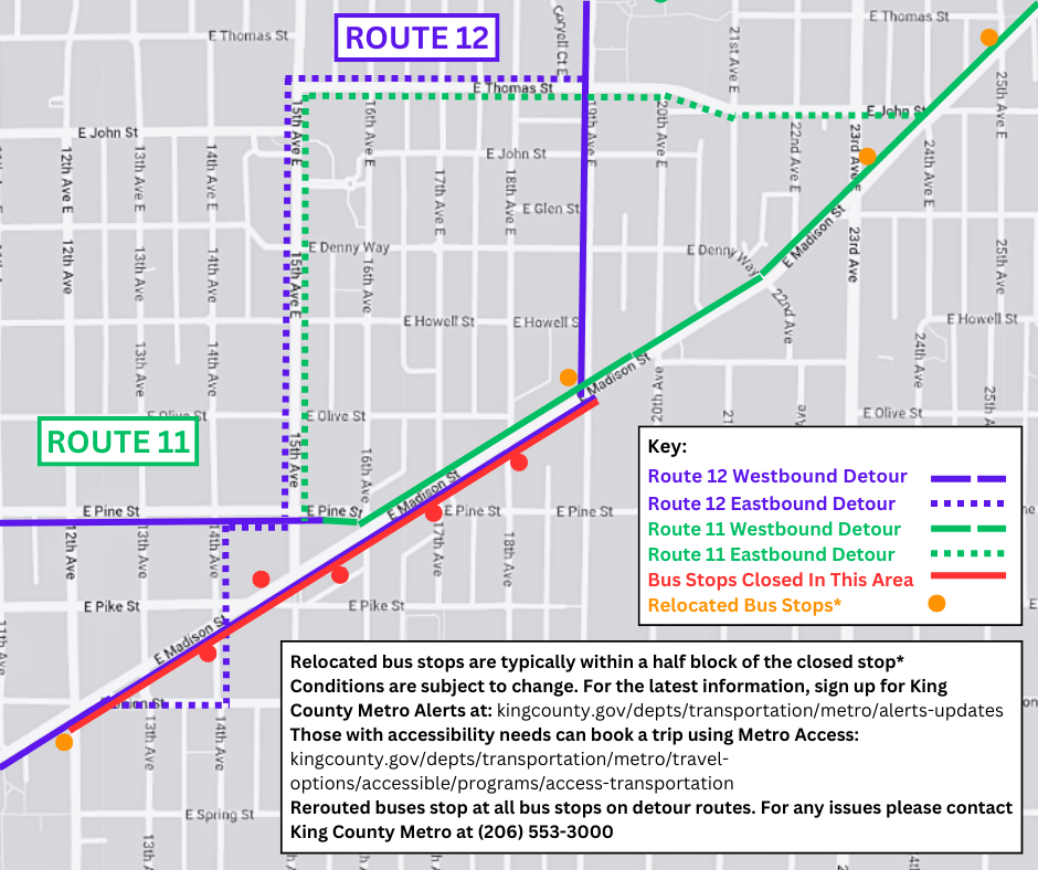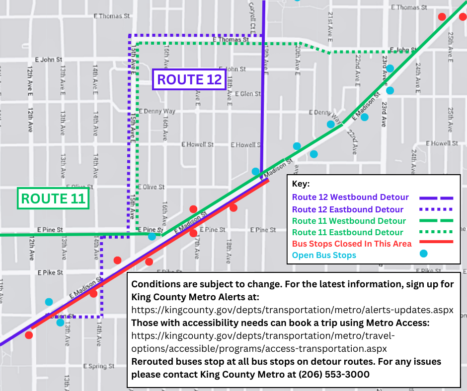 - Eastbound Route 12 buses will be detoured from E Madison St to E Union St to 14th Ave.