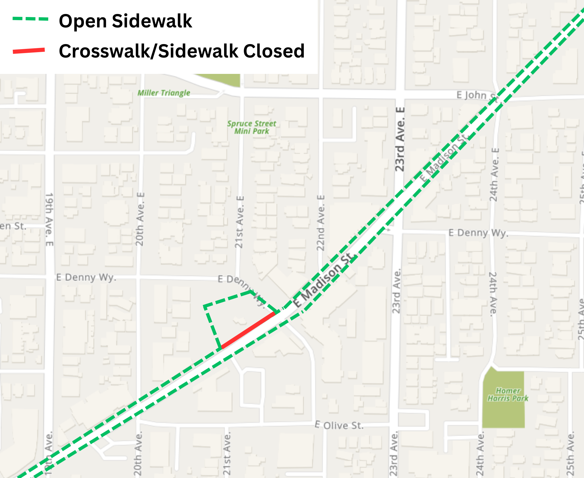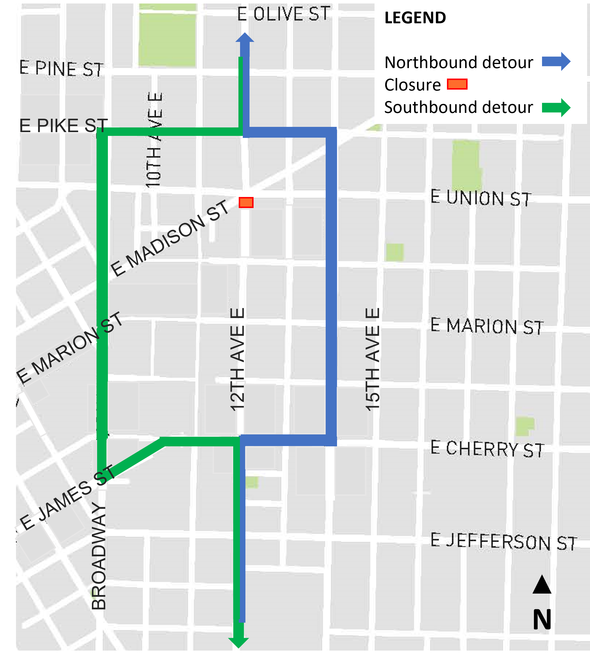 Eastbound E Madison St detoured between 12th Ave and 15th Ave; detour to remain through Spring