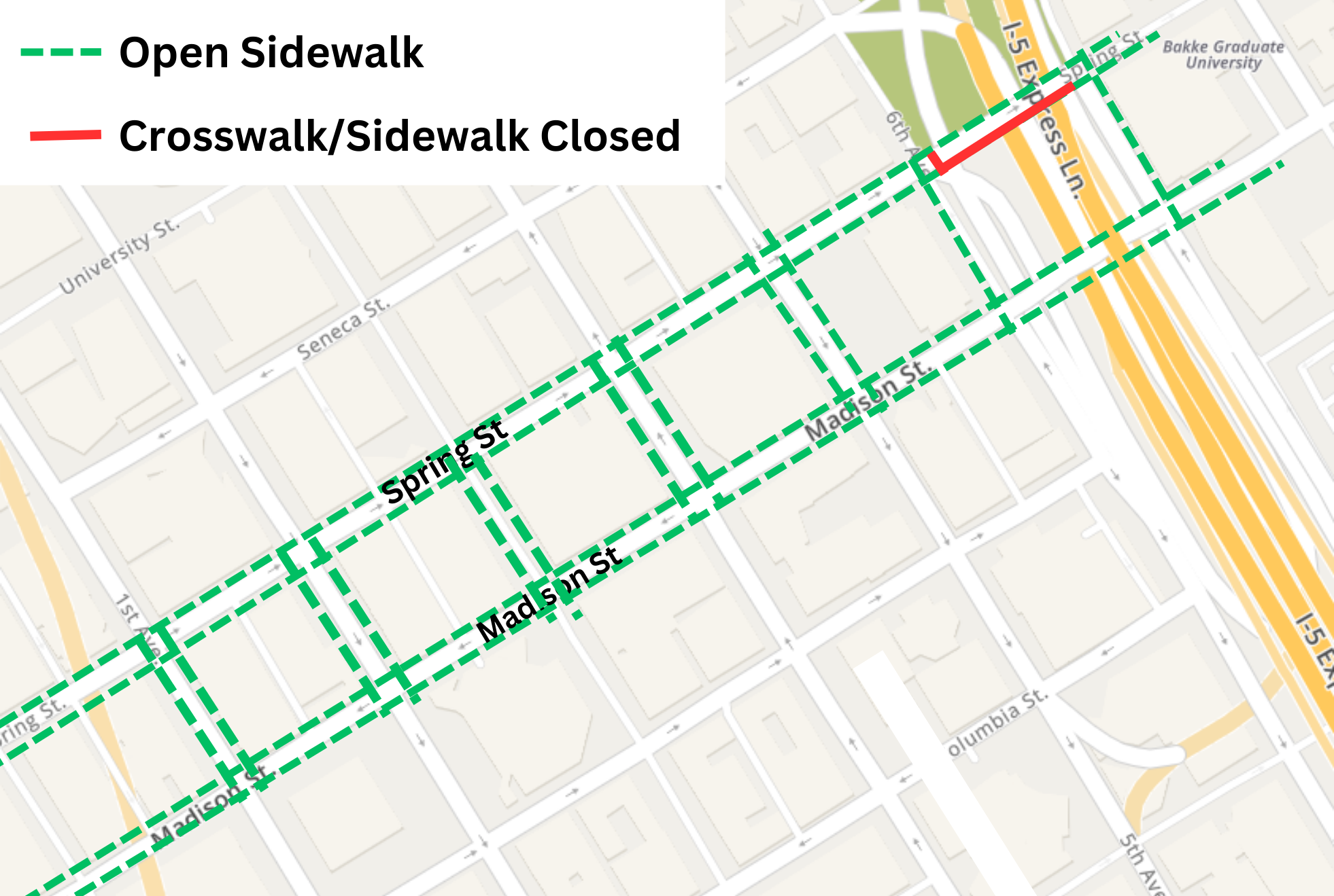 We are working to maintain pedestrian access by installing protected walkways in the street around construction areas. There is not always enough space to install a protected walkway around construction, and sometimes we need to close a crosswalk or sidewalk. The maps below show areas where some sidewalks or crosswalks are closed. Conditions change often, and these maps are current as of March 31. We will update them as conditions change. Click on the links to view the maps.