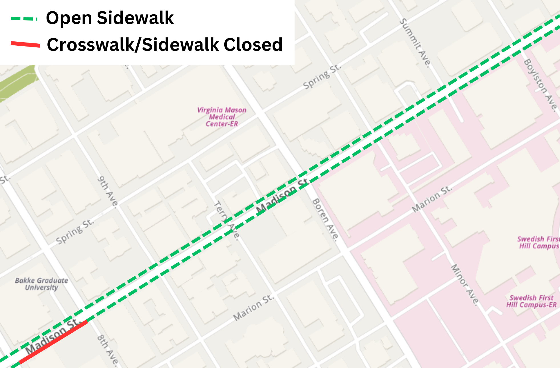 - Building curb bulbs to shorten pedestrian crossings along side streets (Madison St at the intersections of Minor Ave, 10th Ave, 12th Ave, Union St, Pike St, 15th Ave, 18th Ave, 19th Ave, Denny St, John St, and 27th Ave; Spring St at the intersections of 7th, 8th, and 9th avenues)