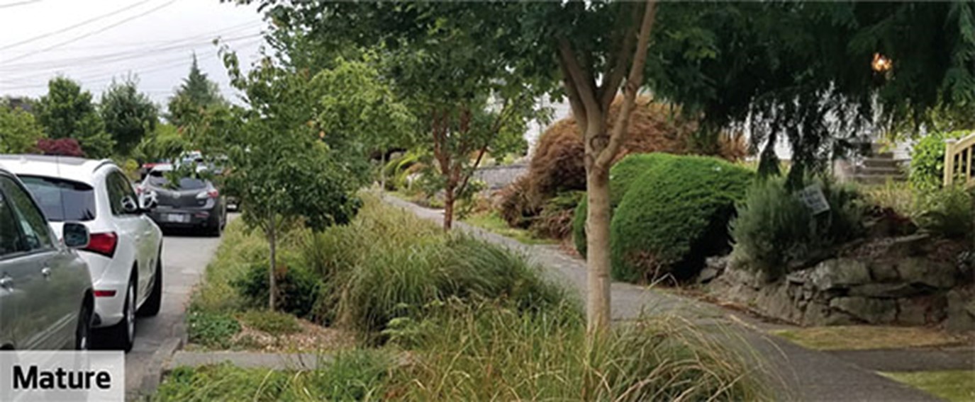 Natural drainage systems are living systems, and their appearance will change over time. The grasses, shrubs, and trees in the natural drainage system will grow and change as the garden matures. It may take up to three years for plants and shrubs in the natural drainage system to reach full maturity, and possibly longer for trees. The examples below show what a natural drainage system may look like over time.