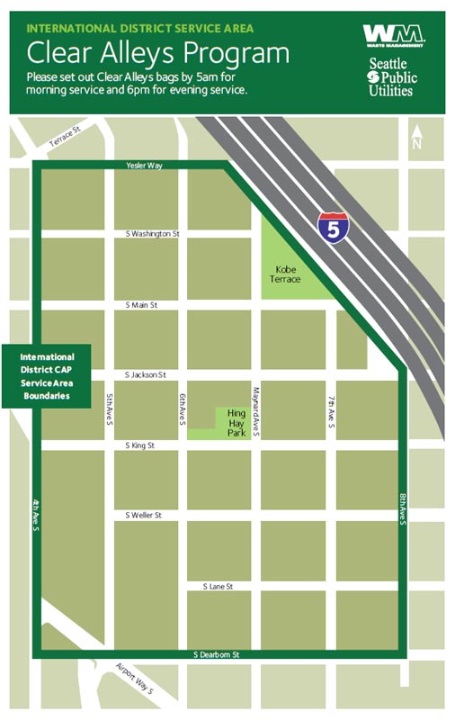 The Clear Alleys Program (CAP) is a City of Seattle initiative designed to keep business districts clean, safe, and accessible by streamlining or eliminating the storage of waste containers in public right-of-way on streets and alleys. Businesses and residential buildings in designated neighborhoods use prepaid garbage and recycling bags with frequent collection services, ensuring right-of-way areas and alleys remain clear for pedestrians, deliveries, and community use.